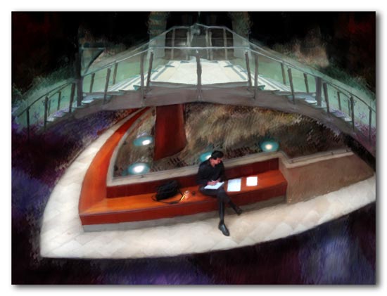 Very futuristic looking. The people are dwarfed by their surroundings and seem so detached and separate. Love the colors in “A scribe”. The deep blue and red diminish into the faded green…a staircase that goes no where. What a wonderful idea to use the space for human creativity, but as the saying goes, “You can’t play the blues in an air conditioned room”.
