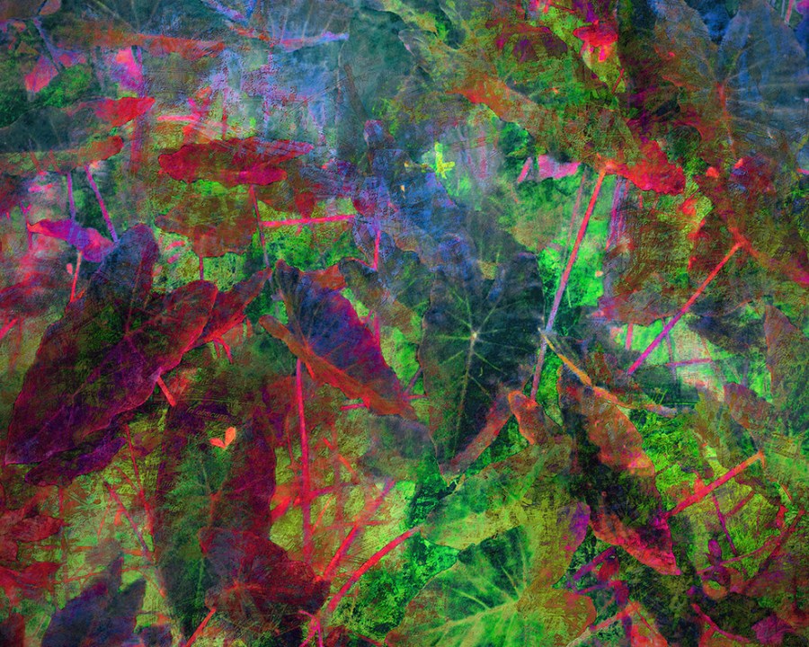 The veins in the leaves and the thicket of plants at the water’s edge.