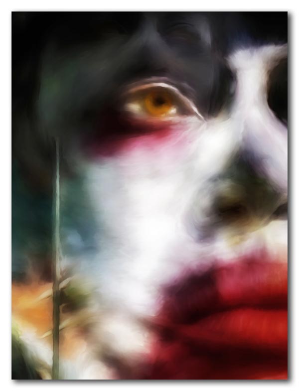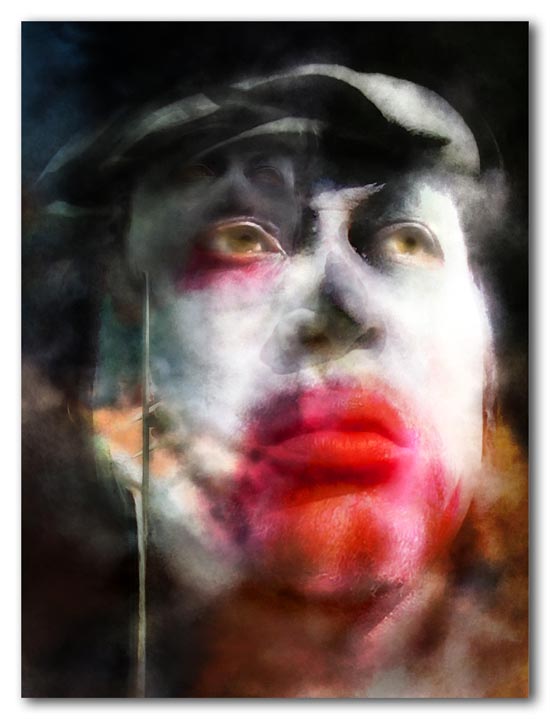 The face below is a rework of an earlier image of a “warrior” re-enacting a part of his heritage. It is cropped more closely, the edges and textures are softer and more painterly, and some of the color is desaturated — all to focus more on his disturbing gaze that nevertheless demands respect.