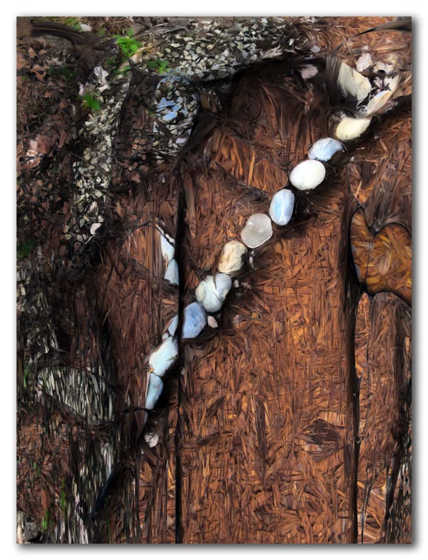 The Mount Washington labyrinth is laid out with smooth and interesting local stones on a bed of soft wood chips. In the center is a bleached brain coral stone surrounded by several beautiful heart shaped stones, one of which forms the background for the image below.