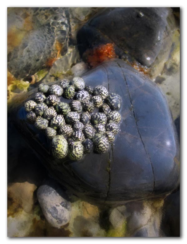 A circle of tightly clustered snails near the water’s surface seems to overlap the circle of rock polished by the action of the sea. Below, an arc highlights a cluster of red globules on the beach next to the round seagrape leaf. While the circle is not always an easy design element to work with, it has always been a powerful symbol and metaphor. These images allude to that power.